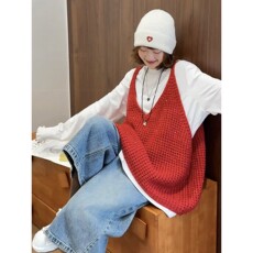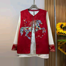 大码女装拼色领底摆流苏盘扣国风马甲胖妹妹新中式秋季款百搭坎肩