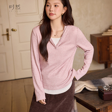 时然大码假两件针织衫微胖mm春季女装撞色长袖T恤新品刺绣开衫