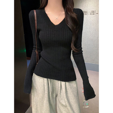 大码胖mmv领长袖针织衫女秋冬韩系修身显瘦内搭打底毛衣气质上衣