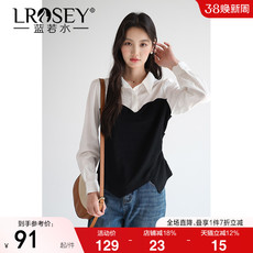 蓝若水大码女装撞色假两件翻领上衣胖MM2026春装新款压褶收腰衬衫