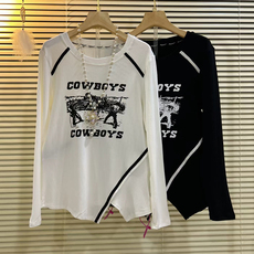 加肥加大码女秋装大码女装圆弧型下摆开叉中长款遮屁股长袖t恤女