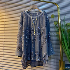 2025新款时尚亮片大衫胖MM显瘦圆领上衣减龄大码女装长袖遮肉衬衫