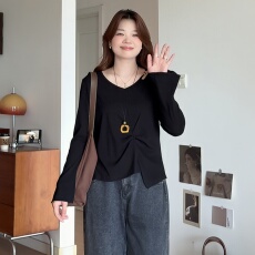 2025年早秋装新款胖mm大码女装宽松长袖木耳蝴蝶结打底衫T恤短袖