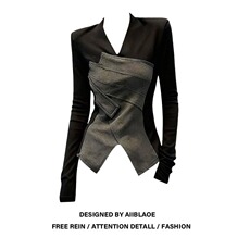 大码美式不规则假两件长袖t恤女2026春秋胖mm磨毛气质设计感上衣