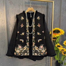 加肥大码女装刺绣蝴蝶国风马甲胖妹妹法式新中式毛边袖口长袖小衫