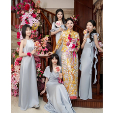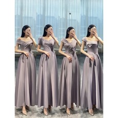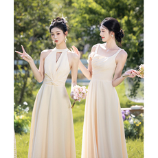 香槟色缎面伴娘服新款姐妹裙小个子主持合唱活动表演宴会高级礼服