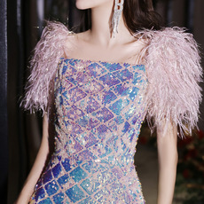 高端轻奢晚礼服前短后长连衣裙小众年会主持显瘦高级感羽毛小个子