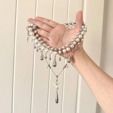 时髦精致多层珍珠串珠金属水滴项链女高级感气质礼服配饰锁骨颈链