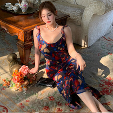 夏 新款大码女装气质200斤收腰斜裁鱼尾吊带连衣裙胖mm雪纺包臀裙