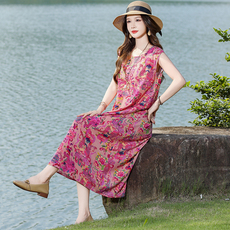 2026新款夏天高端棉绸沙滩裙气质妈妈连衣裙人造棉云南民族风长裙