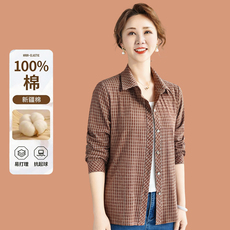 纯棉格子衬衫女长袖上衣中老年人妈妈装春秋新款全棉宽松开衫衬衣