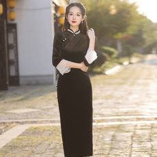 老上海复古风长袖黑色丝绒旗袍2025秋季新款优雅气质长款