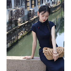 蓝色优雅国风旗袍高档大气民国风2025年新款日常上班可穿复古文艺