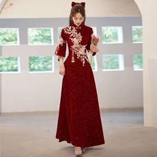 金丝绒旗袍中长袖短款复古喜婆婆婚礼礼服唐装妈妈气质连衣裙优雅