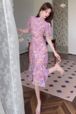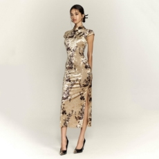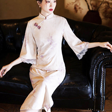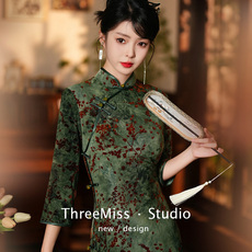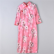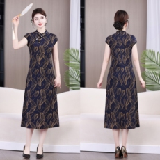 129改良中长款开叉旗袍74536优雅气质修身复古国风印花中袖连衣裙
