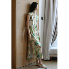 无有无印真丝桑蚕丝凉爽透气优雅印花长款无袖包肩旗袍M23167