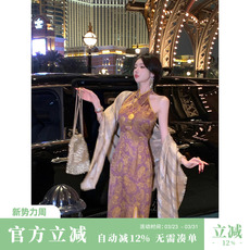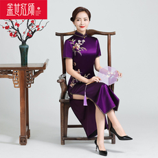 盖世红颜醋酸刺绣绣花旗袍高端优雅时尚秋冬新款修身长旗袍伶雅紫