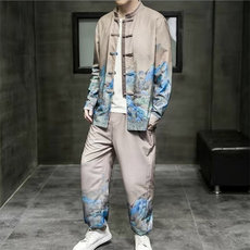 亚麻唐装男棉袄冬季棉花棉衣套装复古连肩袖汉服加厚外套休闲棉服