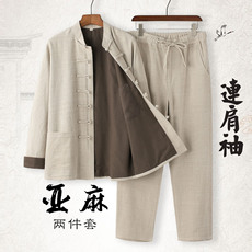 春夏季唐装男中国风棉麻套装中式服装长袖两件套亚麻衣服国潮茶服