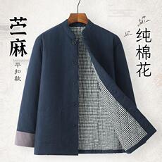 男士冬季加厚保暖中式亚麻中国风唐装男棉花棉袄复古盘扣棉衣外套