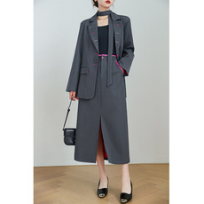 春秋大码女装时尚气质小众显瘦撞色西装开叉半身裙子两件套装胖mm