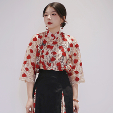 真大鱼大小码胖MM【玫瑰枝蔓】新中式国风小衫网纱刺绣衬衣上衣新