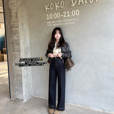 MISS158小个子阔腿牛仔裤女秋季新款美式复古高腰直筒裤拖地裤