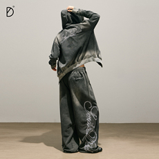 春秋美式复古假两件夹克套装男青少年潮牌宽松痞帅休闲运动套装