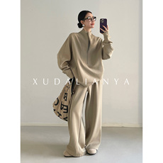 时尚春秋新款洋气减龄休闲运动套装女高级感纯色开衫阔腿裤三件套