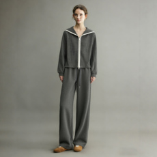 欧货灰系格调~运动休闲套装女假两件拼接连帽上衣阔腿裤2026新款