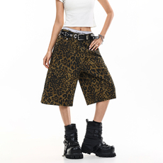 TGFCLUB 美式街头嘻哈说唱迷彩拼接双腰头美金贴布绣宽松牛仔短裤