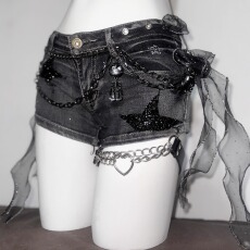 TDH原创*哥特亚文化立体手作装饰美式摇滚做旧水洗牛仔裤超短裤子