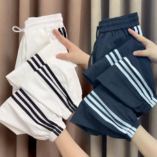 七分运动裤女夏季薄款高腰胖mm黑色显瘦学生白边运动裤哈伦裤
