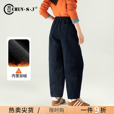 加绒加厚灯芯绒裤子女冬季茧型小个子复古休闲萝卜裤哈伦裤女九分