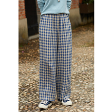 忘城H1320座/午夜蓝调/秋季新款14支亚麻复古蓝格子哈伦裤裤子女