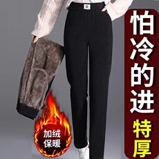 冬季高腰黑色弹力加绒加厚款牛仔裤直筒裤哈伦裤宽松休闲裤9分裤