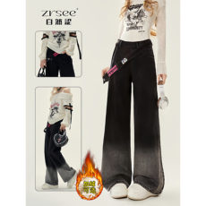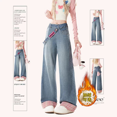 自然涩浅蓝色侧拉链牛仔裤女款冬季加绒新款格纹翻边阔腿裤子春秋