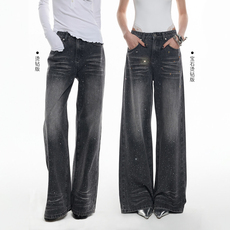 复古蓝烫钻高腰阔腿裤牛仔裤女九分裤宽松弹力显瘦直筒裤拖地裤子