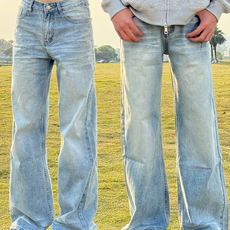 记得加辣美式复古水洗做旧猫须牛仔裤男女宽松百搭浅蓝色直筒裤子