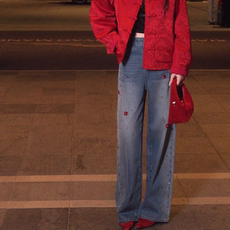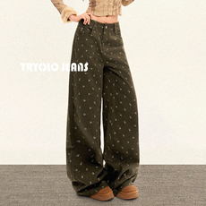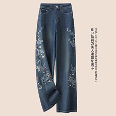 重工刺绣阔腿牛仔裤女2025春秋新款时尚高腰宽松显瘦直筒拖地裤子
