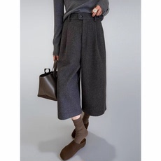 韩国东大门秋冬新款高腰系扣灰色毛呢五分裤女外穿西装休闲阔腿裤