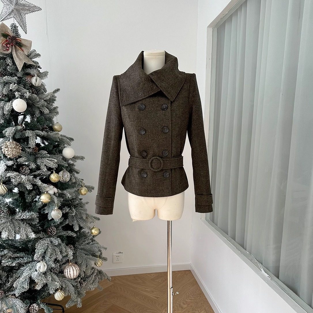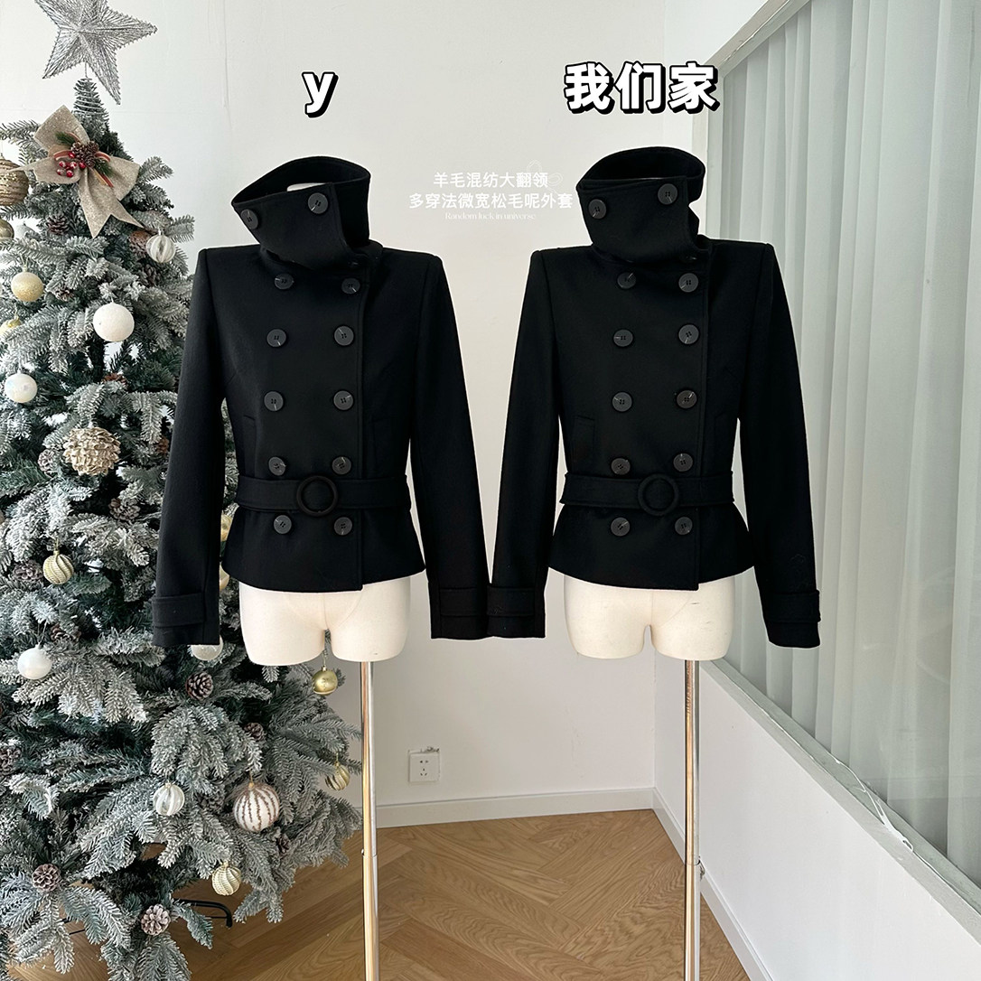 柒月末 羊毛混纺大翻领多穿法双排扣同料腰带微宽松短薄毛呢外套