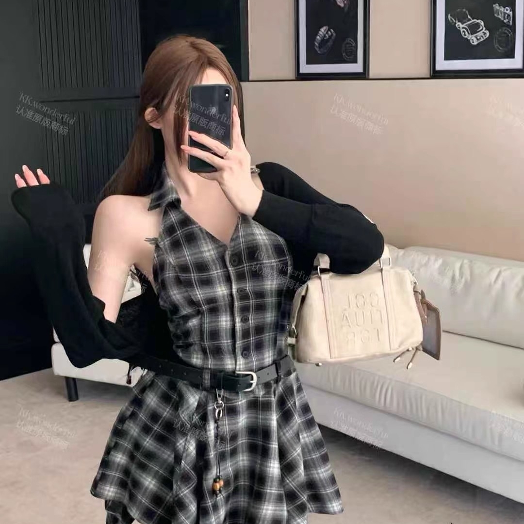2025秋冬新美拉德复古辣妹翻领挂脖格子连衣裙腰带开衫毛衣套装女