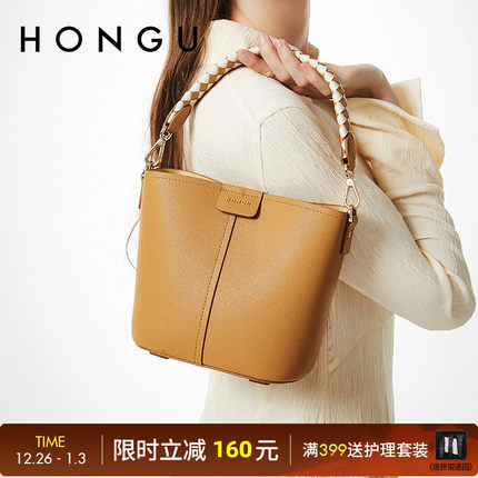 红谷包包新款牛皮单肩包时尚编织撞色高级水桶包小众腋下女士包