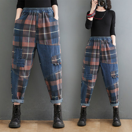 大码松紧腰牛仔拼色格子哈伦裤女
