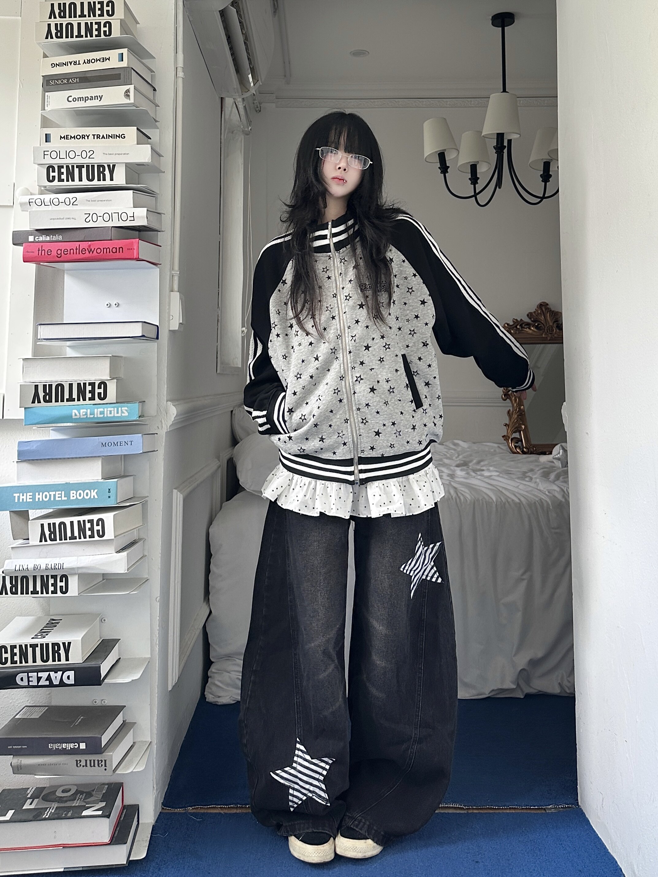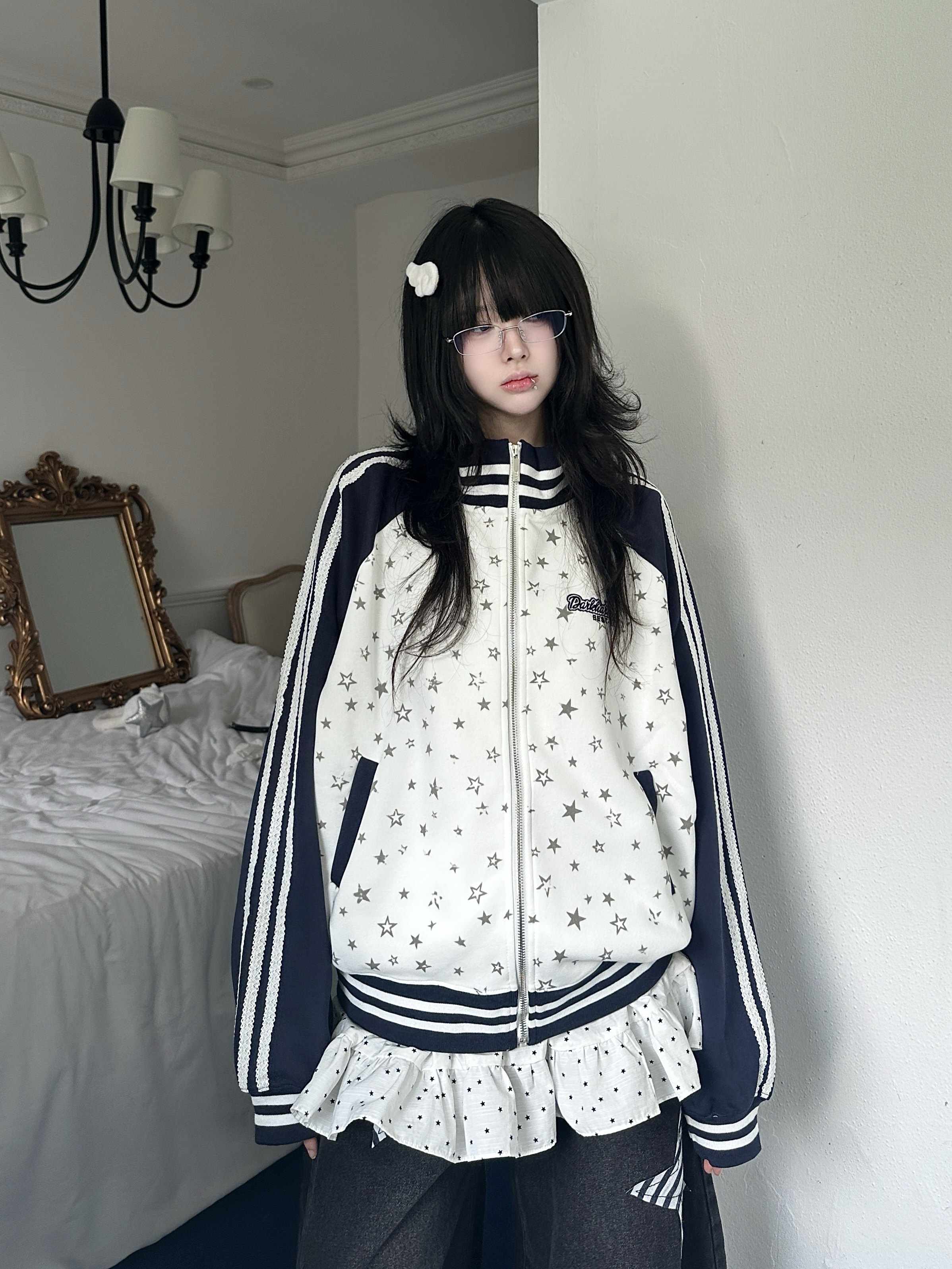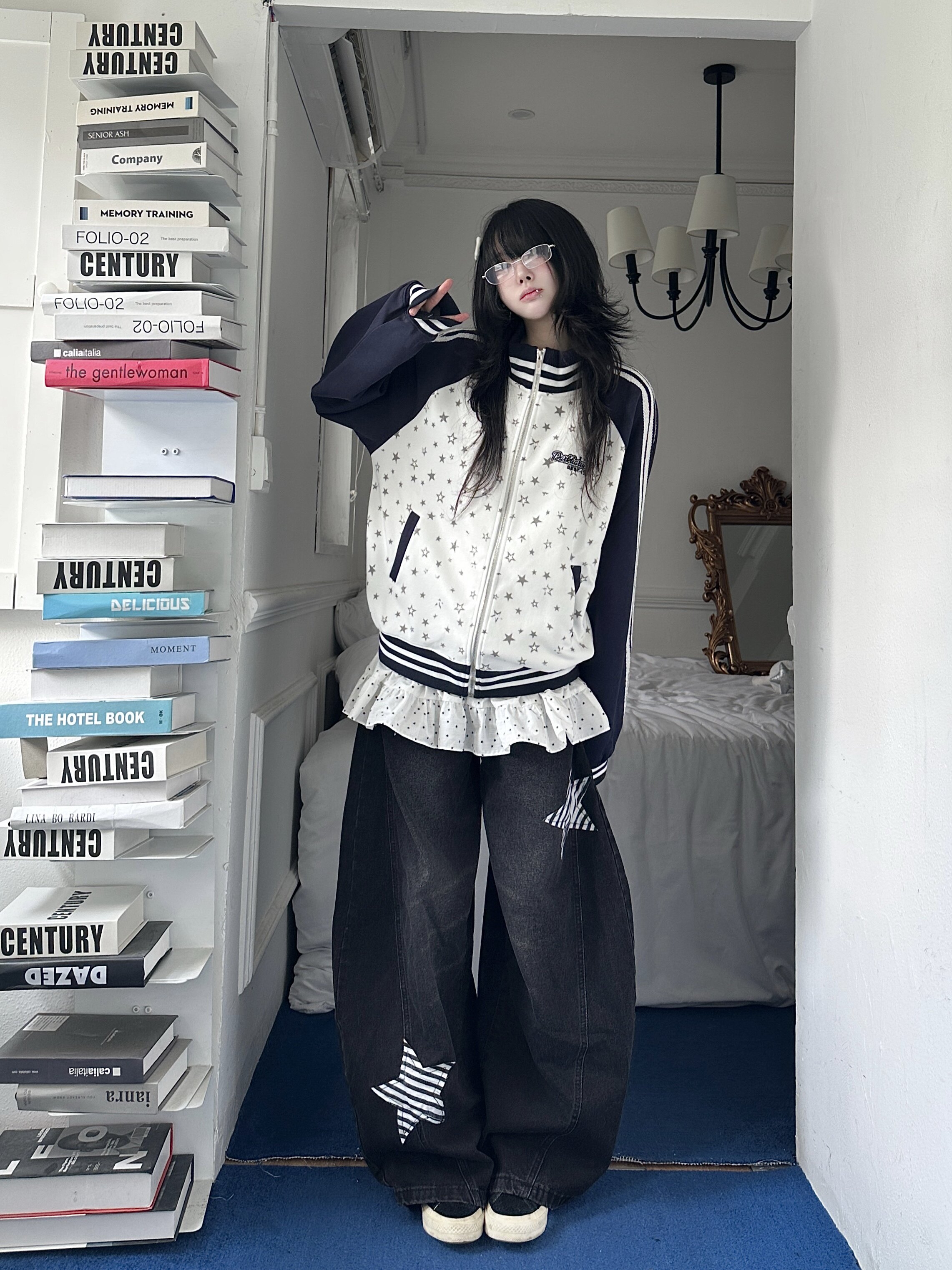 咖喱人秋季新款星星印花拼接撞色棒球服外套女宽松百搭夹克上衣潮
