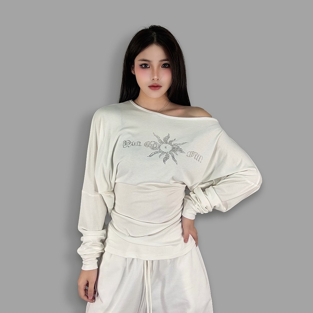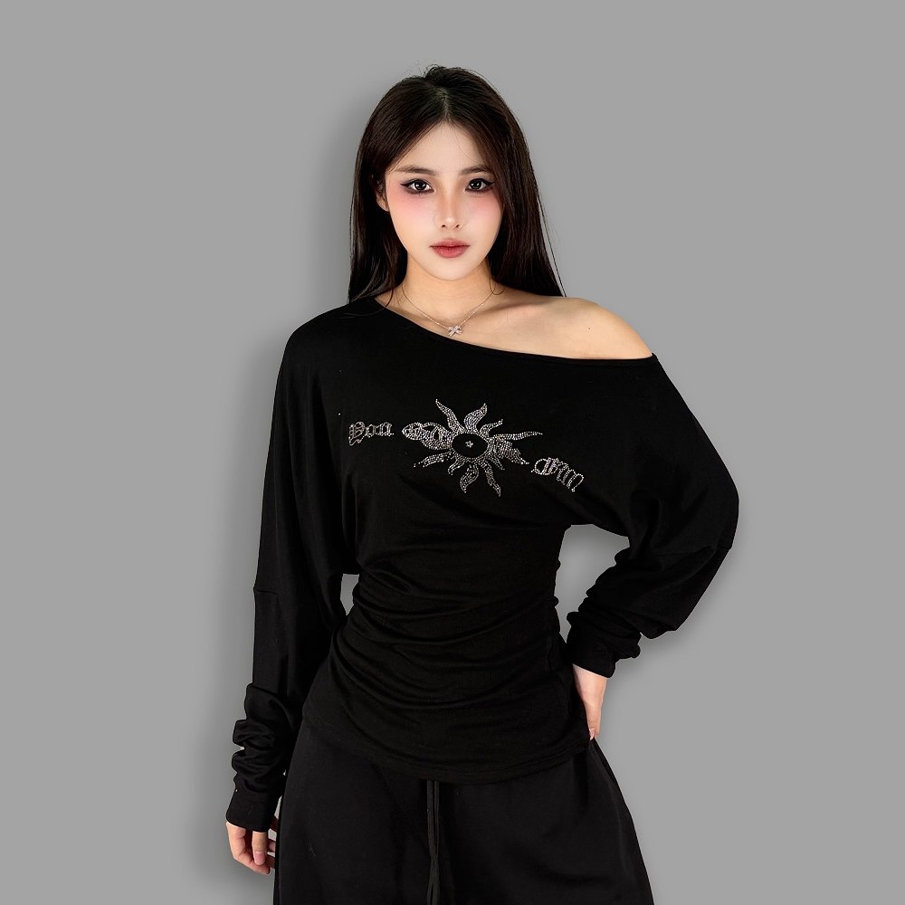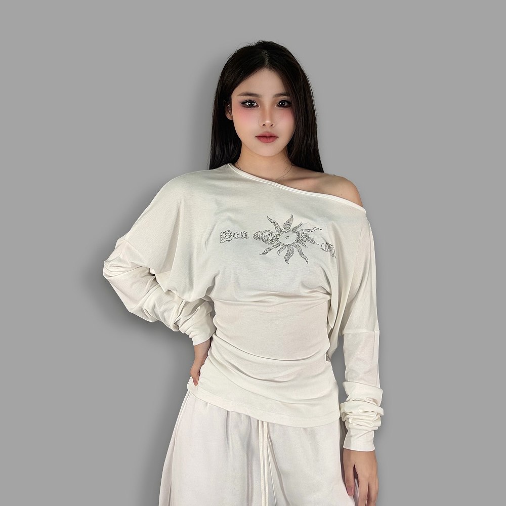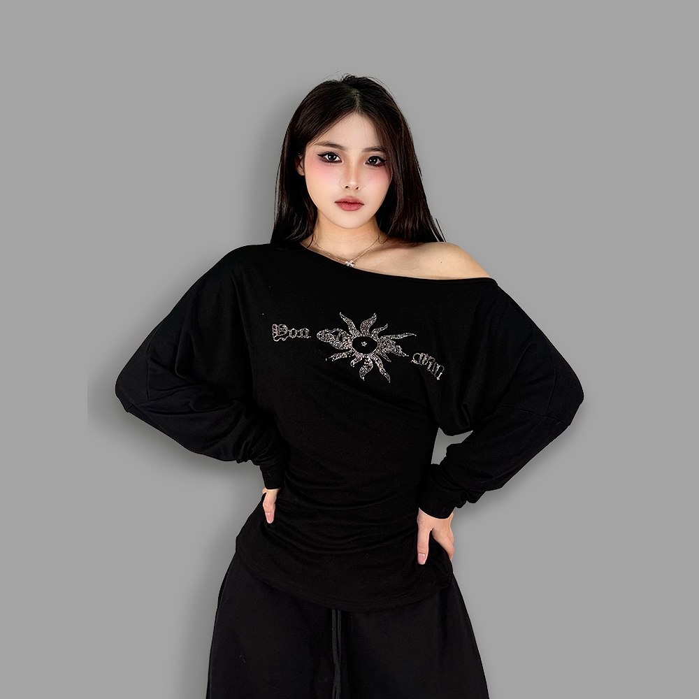 ROKBBK-K/布韩休闲慵懒风露肩长袖T恤女辣妹风字母印花百搭上衣