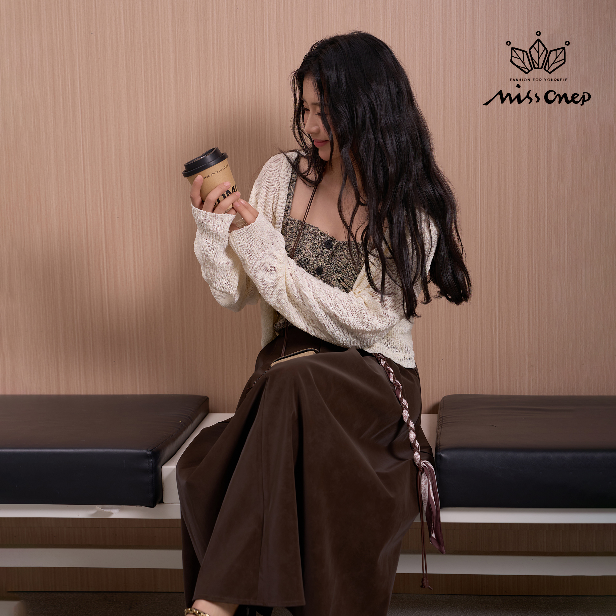 Missonep逸【沉香至】复古棕配编织腰带长款半身裙女2025冬季新款
