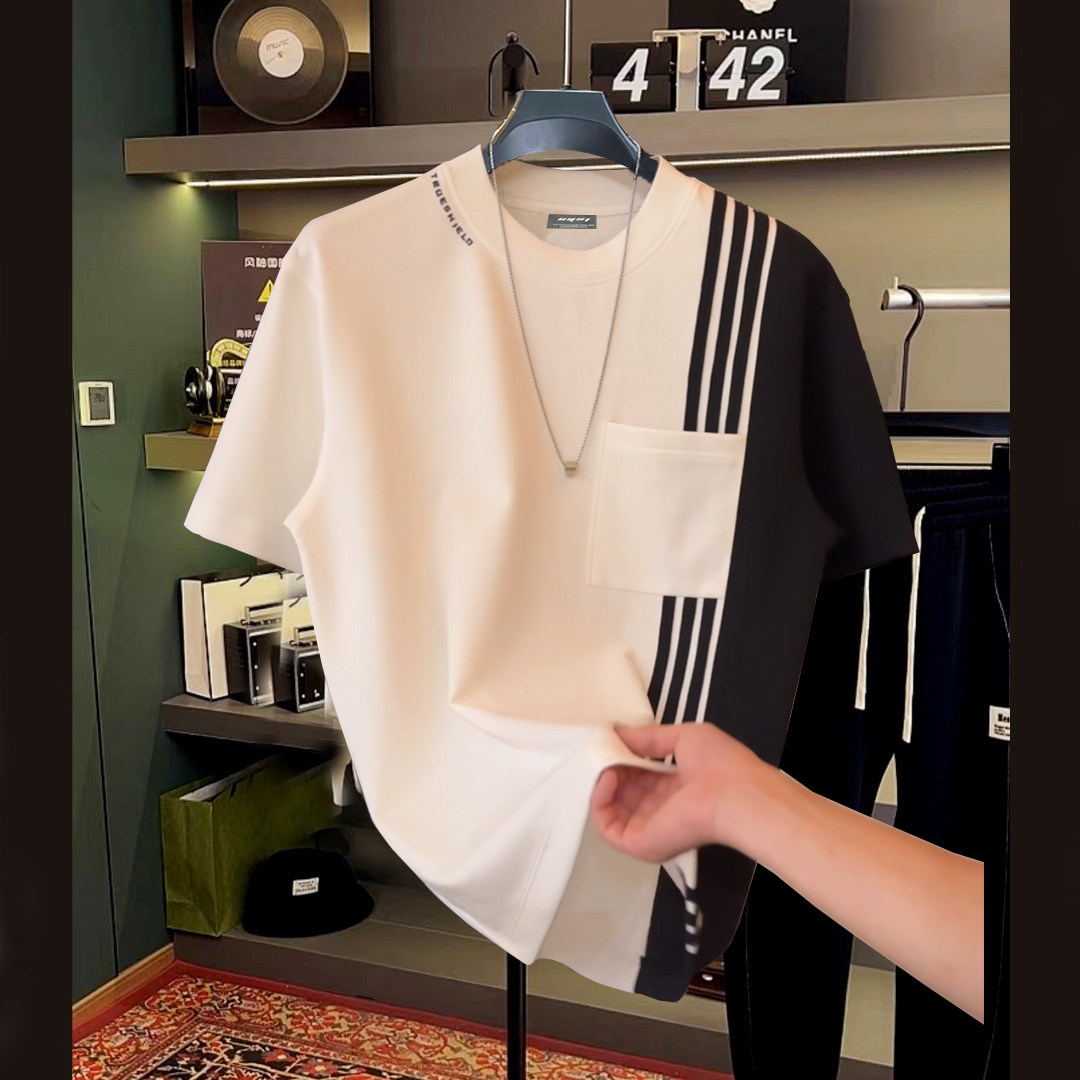 夏季条纹短袖T恤男原创个性圆领轻奢简约拼接百搭透气半袖上衣潮