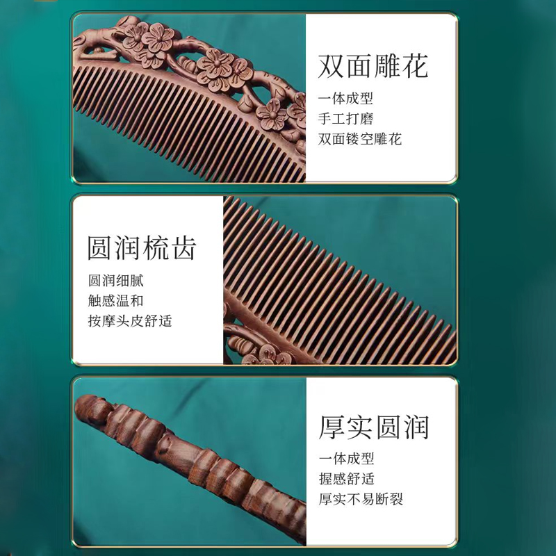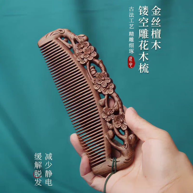 黑金檀雕花木梳女士专用经络疏通防脱发家用蓬松头发天然檀木梳子